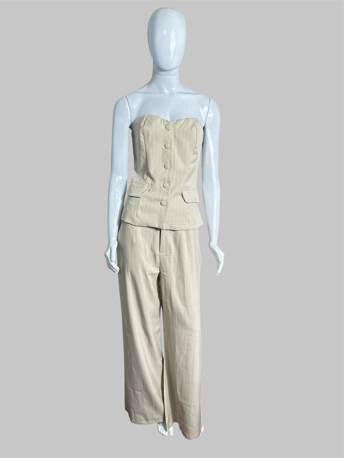 Com um design impecável, ele combina a estrutura refinada da calça risca de giz com a sensualidade sofisticada do corpete ajustado, criando um look poderoso para qualquer ocasião.